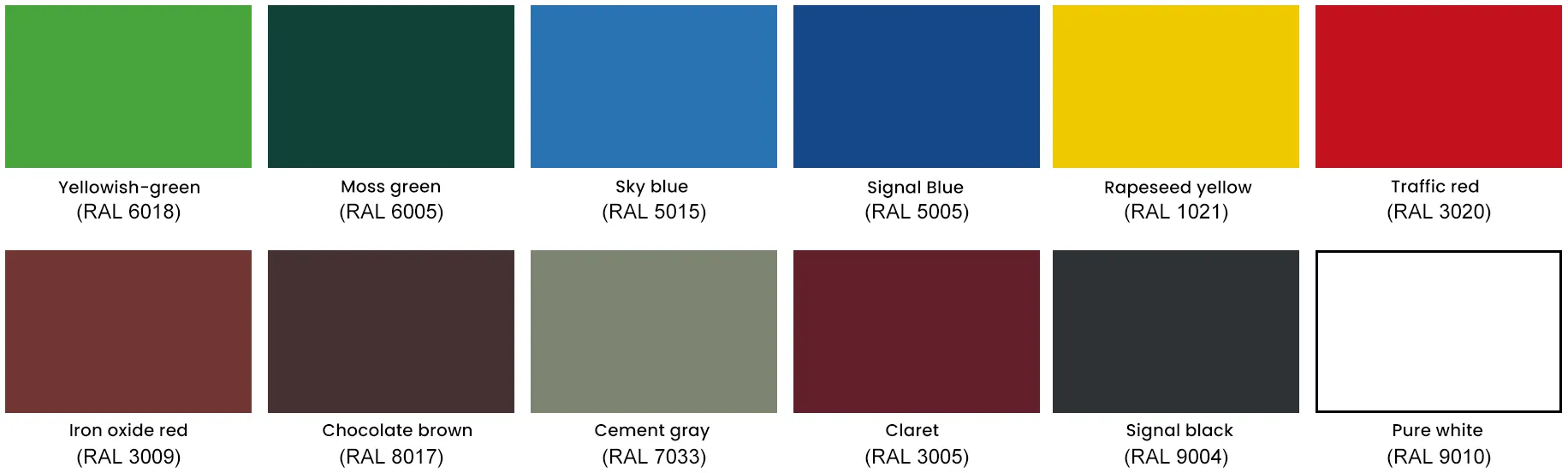 Yellow green RAL 6018, sky blue RAL 5015, signal blue RAL 5005, rape yellow RAL 1021, traffic red 3020, moss green RAL 6005, oxide red RAL 3009, chocolate brown RAL 8017, cement gray RAL 7033, wine red RAL 3005, signal black RAL 9004, Pure White RAL 9010.